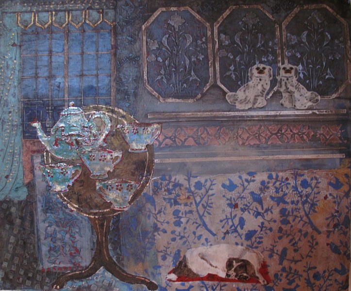 Interior with Staffordshire China Dogs and Springer Spaniel acrylic, gesso, gold leaf 60x40cms